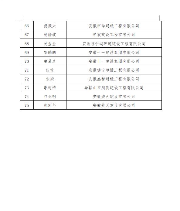 根据《关于开展2025年度马鞍山市建筑企业优秀项目经理(建造师)评价工作的通知》(建协〔2025〕11号)要求,经企业自愿申报、资格初审,并于2025年11月28日经2025年度马鞍山市建筑业企业优秀项目经理(建造师)评价委员会审议通过,确定鲁德建等75名同志为2025年度马鞍山市建筑业企业优秀项目经理(建造师),并于2025年12月2日至12月8日进行了公示。公示无异议,现将评价结果予以正式公布。